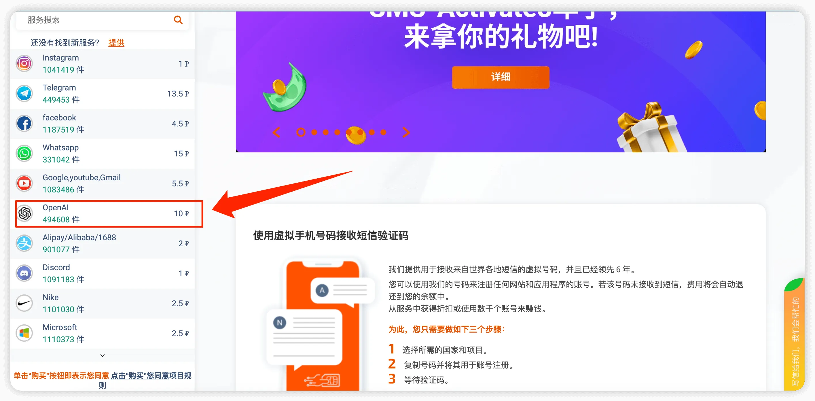 我们返回 接码平台,点击左上角LOGO回到网站主页,下拉选择 OpenAI项目接码.