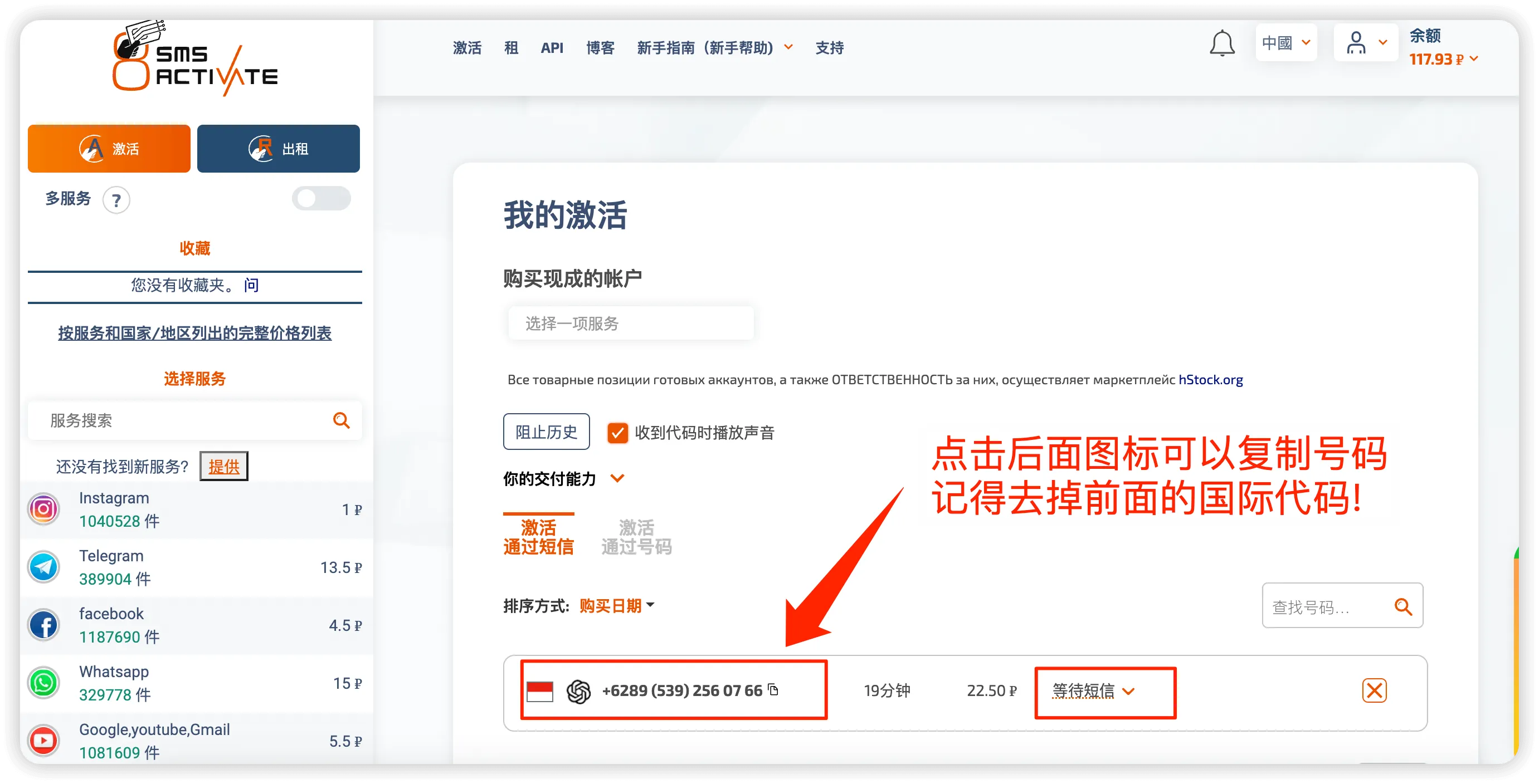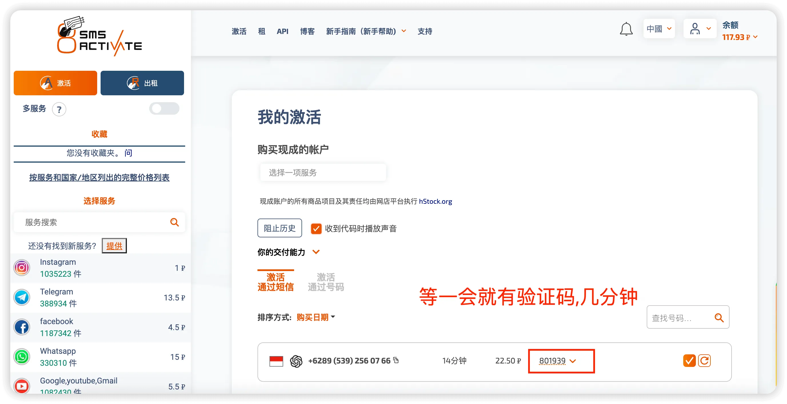 直接点击后面的购物车篮子按钮,直接就购买成功,跳到如下页面,会有手机号展示,然后是等待接码状态;