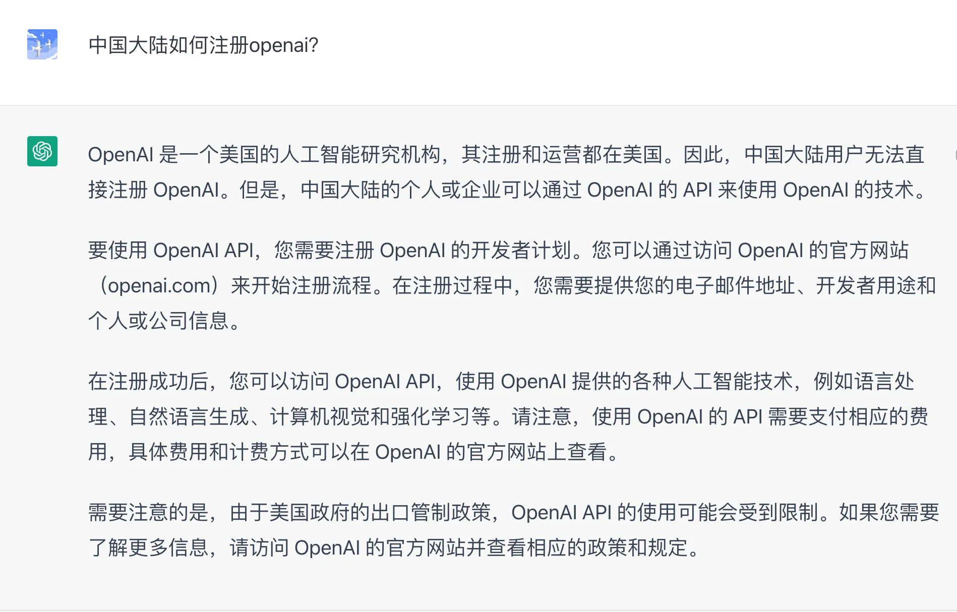 需要注意的是,由于美国政府的出口管制政策,OpenAI API 的使用可能会受到限制。如果您需要了解更多信息,请访问 OpenAI 的官方网站并查看相应的政策和规定。